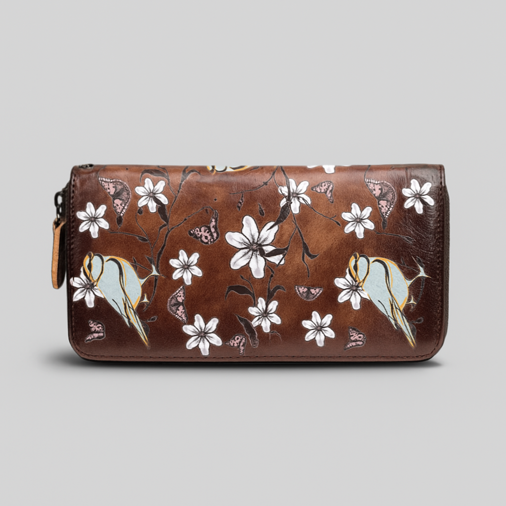 Delicate and timeless, Amara captures the serene harmony between nature and grace. Hand painted blossoms drift across the leather, where slender birds rest among gentle stems and petals. Each detail, from the soft shading of the flowers to the fluid curvature of every line, reflects patience, artistry, and balance. The design evokes the calm of a spring morning, a quiet conversation between craftsmanship and the natural world. Amara is a portrait of still beauty, refined and enduring an expression of elegance that feels both eternal and alive.
