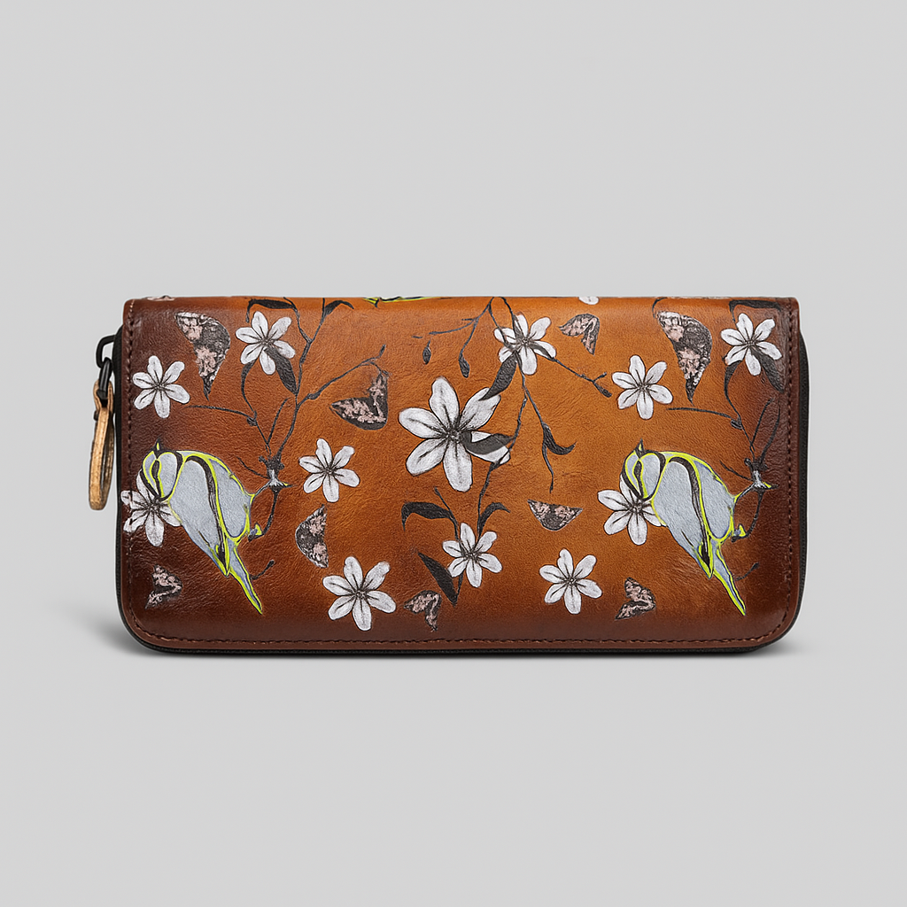 Delicate and timeless, Amara captures the serene harmony between nature and grace. Hand painted blossoms drift across the leather, where slender birds rest among gentle stems and petals. Each detail, from the soft shading of the flowers to the fluid curvature of every line, reflects patience, artistry, and balance. The design evokes the calm of a spring morning, a quiet conversation between craftsmanship and the natural world. Amara is a portrait of still beauty, refined and enduring an expression of elegance that feels both eternal and alive.