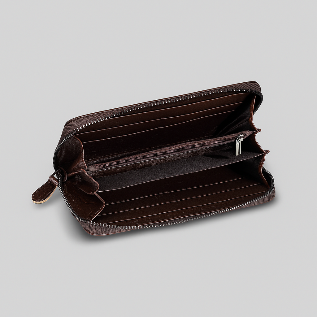 Crafted from premium first-layer cowhide leather, this wallet offers exceptional durability with a naturally soft, refined touch. Its medium-soft structure provides a comfortable feel while maintaining its shape over time. Designed in a timeless retro style, it features a secure zipper closure and a neatly finished polyester lining.