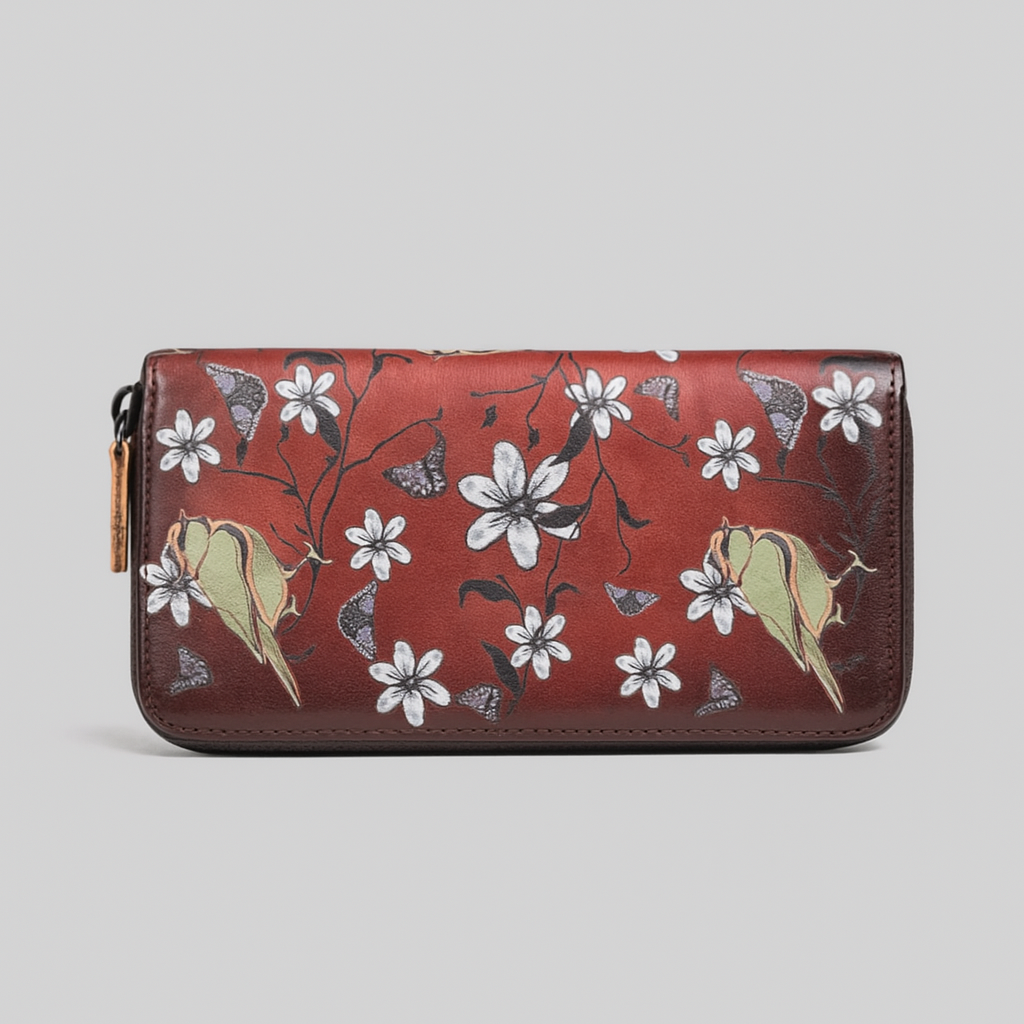 Delicate and timeless, Amara captures the serene harmony between nature and grace. Hand painted blossoms drift across the leather, where slender birds rest among gentle stems and petals. Each detail, from the soft shading of the flowers to the fluid curvature of every line, reflects patience, artistry, and balance. The design evokes the calm of a spring morning, a quiet conversation between craftsmanship and the natural world. Amara is a portrait of still beauty, refined and enduring an expression of elegance that feels both eternal and alive.