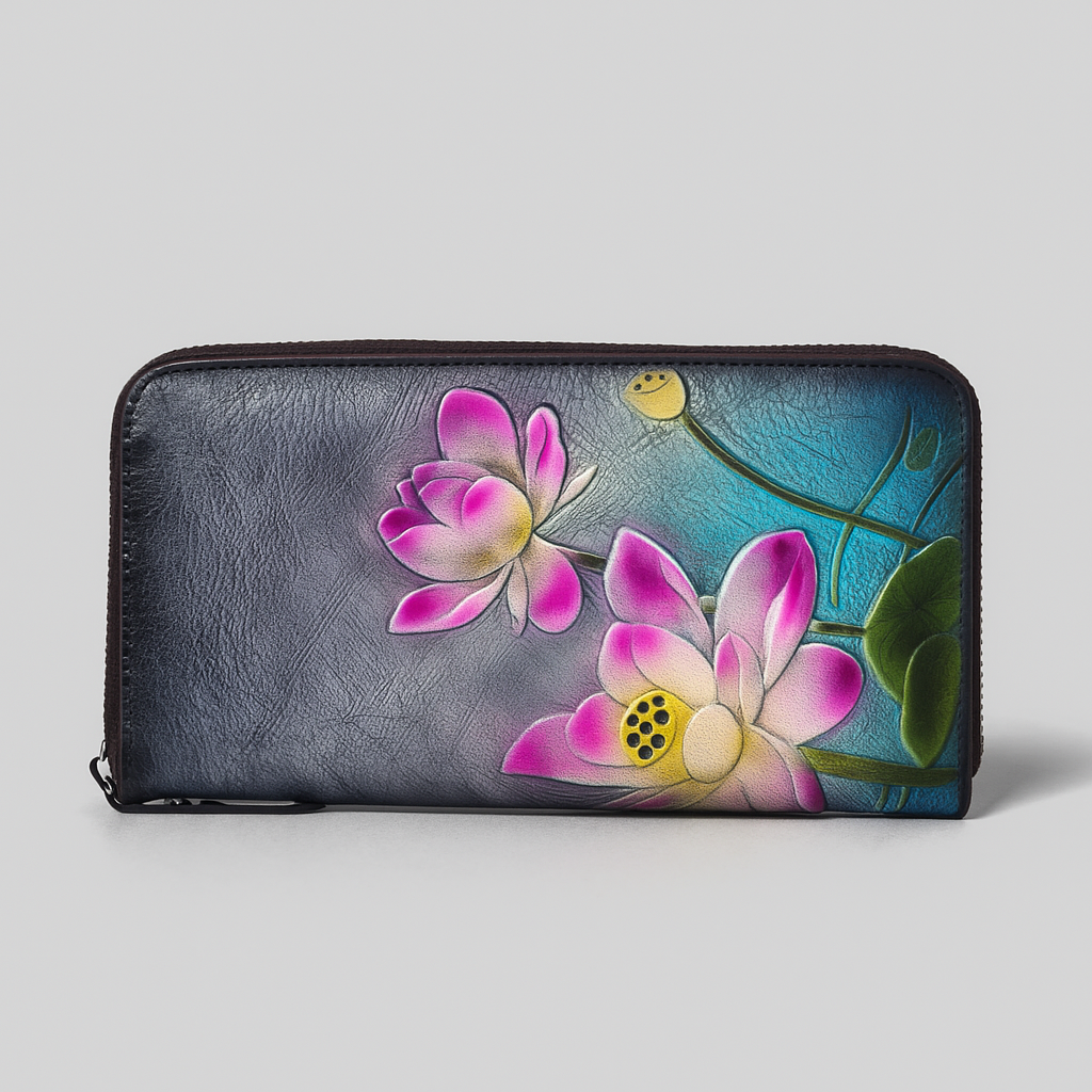 A portrait of serenity and renewal, Lotara is inspired by the tranquil beauty of the lotus, a timeless emblem of purity and awakening. Each petal is hand-tooled and brushed in gentle shades of rose, ivory, and gold, unfolding gracefully across soft gradients that echo the meeting of earth and sky. The composition flows with quiet harmony, a balance of depth, light, and stillness. Lotara speaks to the art of reflection and the elegance of becoming, where craftsmanship and nature unite in a single breath of calm and grace.