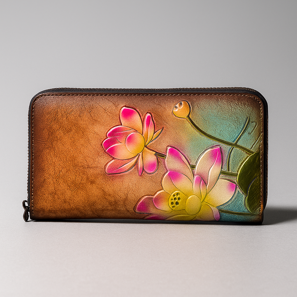 A portrait of serenity and renewal, Lotara is inspired by the tranquil beauty of the lotus, a timeless emblem of purity and awakening. Each petal is hand-tooled and brushed in gentle shades of rose, ivory, and gold, unfolding gracefully across soft gradients that echo the meeting of earth and sky. The composition flows with quiet harmony, a balance of depth, light, and stillness. Lotara speaks to the art of reflection and the elegance of becoming, where craftsmanship and nature unite in a single breath of calm and grace.