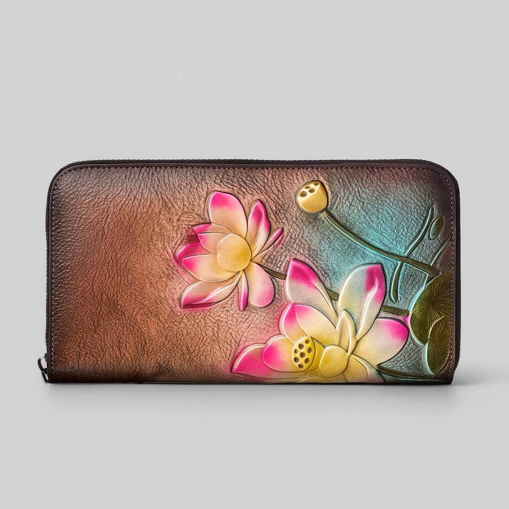 A portrait of serenity and renewal, Lotara is inspired by the tranquil beauty of the lotus, a timeless emblem of purity and awakening. Each petal is hand-tooled and brushed in gentle shades of rose, ivory, and gold, unfolding gracefully across soft gradients that echo the meeting of earth and sky. The composition flows with quiet harmony, a balance of depth, light, and stillness. Lotara speaks to the art of reflection and the elegance of becoming, where craftsmanship and nature unite in a single breath of calm and grace.
