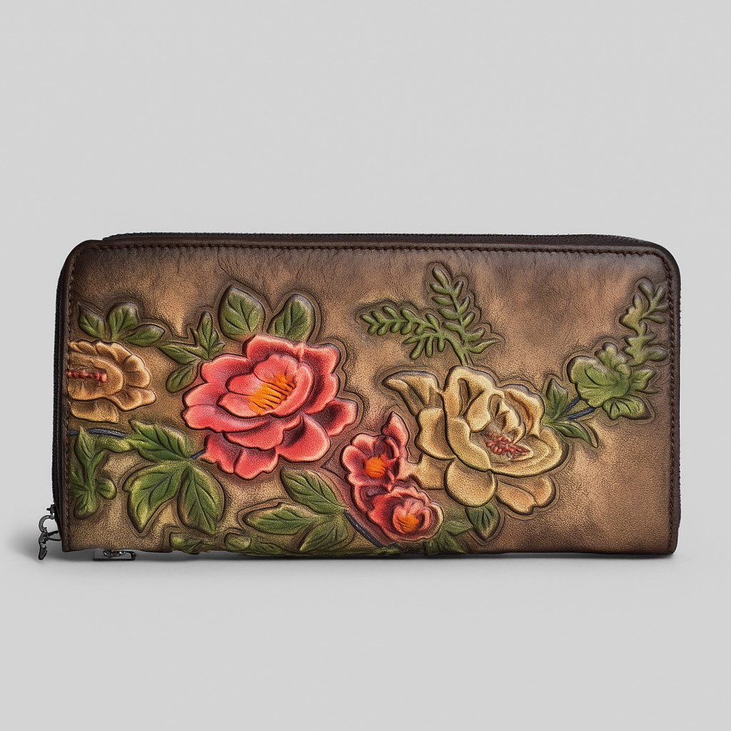 A celebration of elegance in perpetual bloom, Jardine evokes the serenity of an eternal garden - where petals unfurl in sculpted relief and color whispers through every contour. Each hand-tooled blossom, shaded in delicate tones of rose, ivory, and amber, reveals the quiet poetry of craftsmanship and nature entwined. The leather’s burnished glow enhances every petal’s depth, lending the design a timeless warmth. Graceful and radiant, Jardine stands as a tribute to artistry born of devotion - a portrait of romance, refinement, and the enduring beauty of life in bloom.